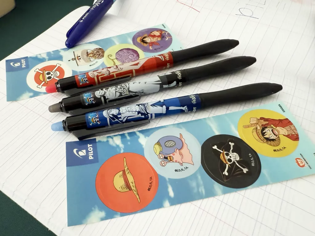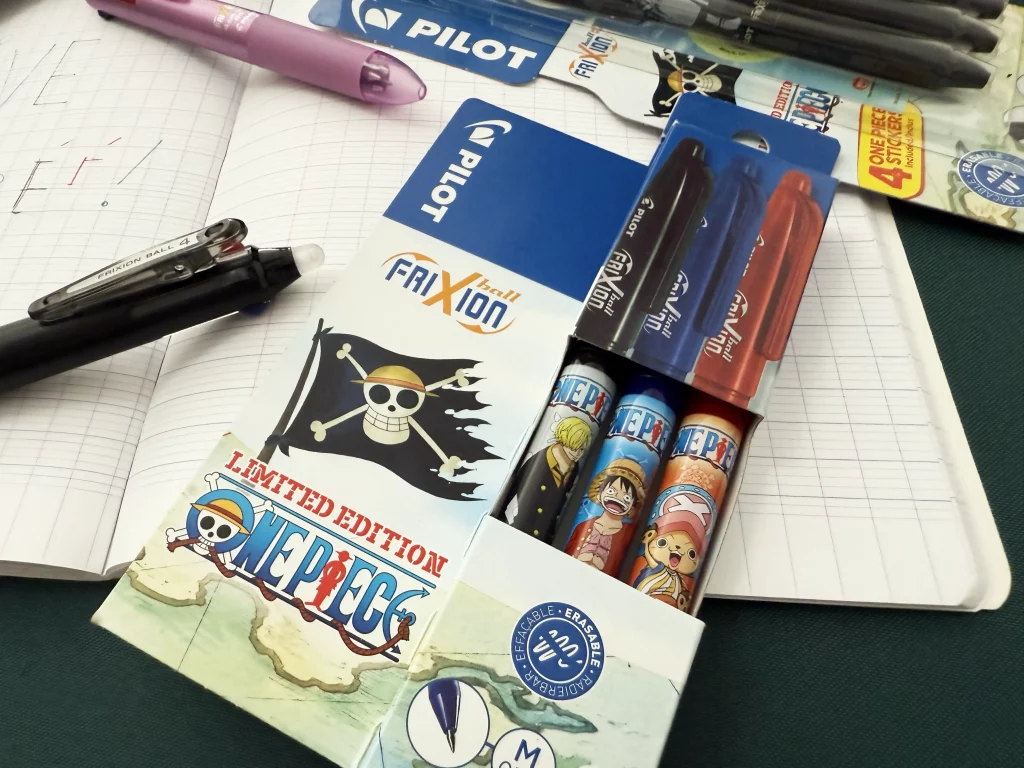 Le FriXion Ball+ est la grande nouveauté de cette rentrée. Fabriqué en France, il se distingue par une ergonomie repensée : son corps triangulaire facilite la prise en main, ce qui est particulièrement utile pour les plus jeunes qui n’ont pas encore une écriture parfaitement fluide. Il est également composé à 82 % de plastique recyclé, ce qui en fait un choix plus respectueux de l’environnement. Avec lui, Pilot montre qu’il est possible d’allier innovation, écologie et plaisir. Dans la version One Piece, le FriXion Ball+ devient non seulement un outil performant, mais aussi un objet de collection.
