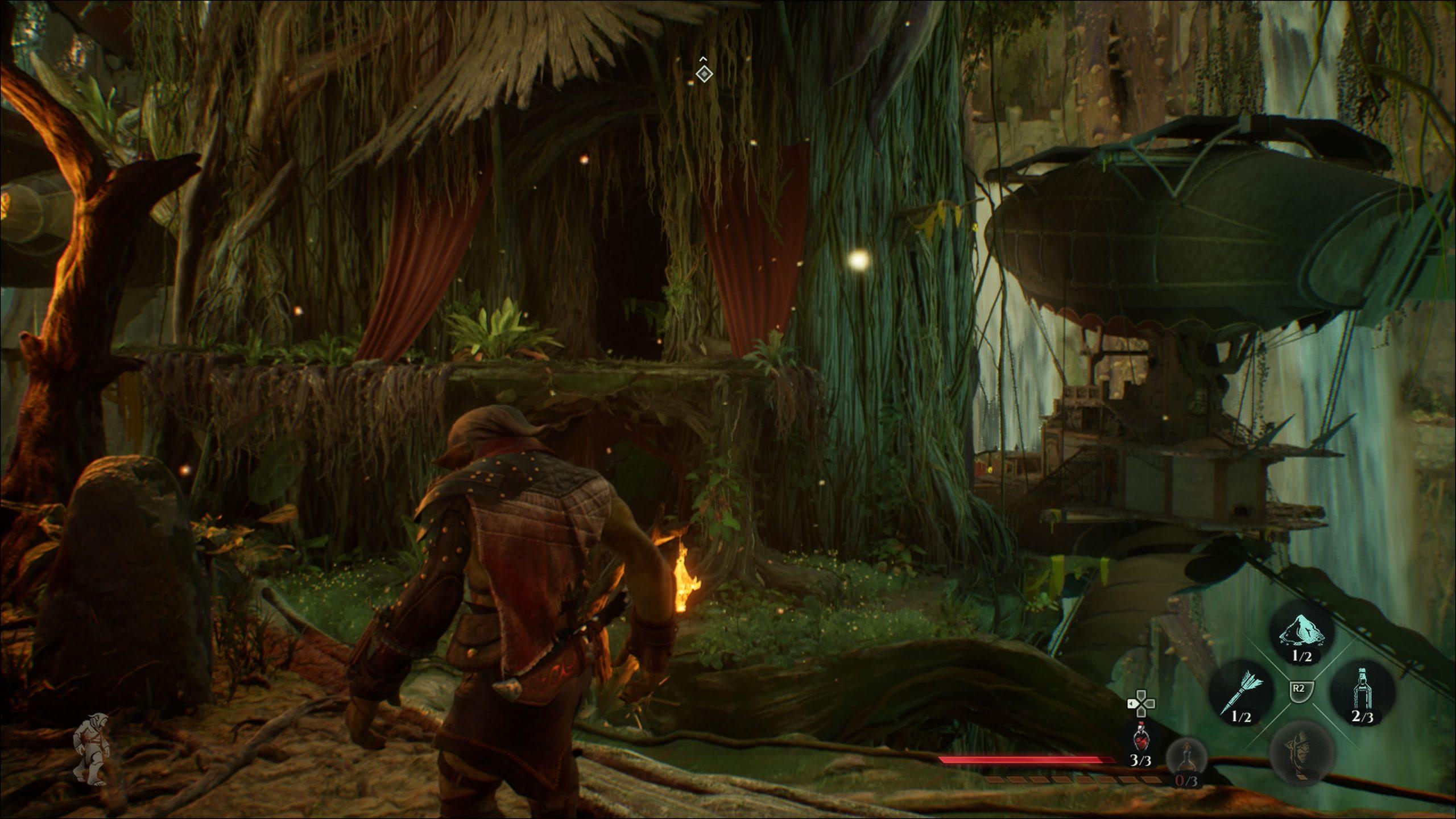 Le principal problème de cet épisode réside dans son ambition mal canalisée. Le jeu nous promet monts et merveilles à travers le continent d’Iserian, mais la réalité est bien plus chiche : vous ne parcourrez que trois zones majeures : le Mur, l’Aube Turquoise et les Ruines d’Akenash. Si l’Aube Turquoise apporte une bouffée d’oxygène avec sa végétation luxuriante et ses pièges naturels, les deux autres zones se ressemblent trop. On passe notre temps à arpenter des couloirs de pierre et des structures froides. Cette pauvreté géographique est accentuée par une structure de quête qui frise l’indigestion. Le jeu se découpe en 4 actes, mais votre objectif ne varie jamais : trouver des fragments de Quartz. Pour y arriver, vous sortez votre boussole et vous tentez de naviguer dans des environnements verticaux où la caméra, souvent capricieuse, semble parfois être votre pire ennemie.