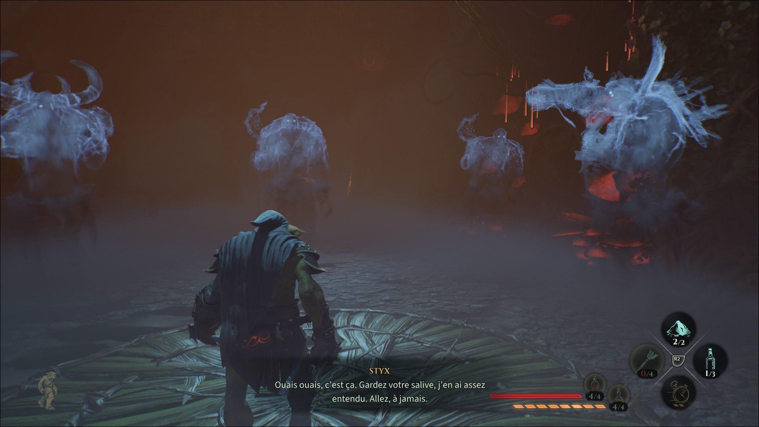 Côté ambiance sonore, le constat est tout aussi mitigé. Styx, d’ordinaire si bavard et piquant, m’a paru étrangement plat dans cet opus. Ses répliques tournent vite en boucle, tout comme celles des PNJ qui répètent les mêmes trois phrases pendant 30 heures. Les musiques, bien qu’efficaces au début pour poser l’ambiance, manquent cruellement de profondeur et finissent par devenir un bruit de fond lancinant qui participe à cette sensation de fatigue généralisée en fin d’aventure.